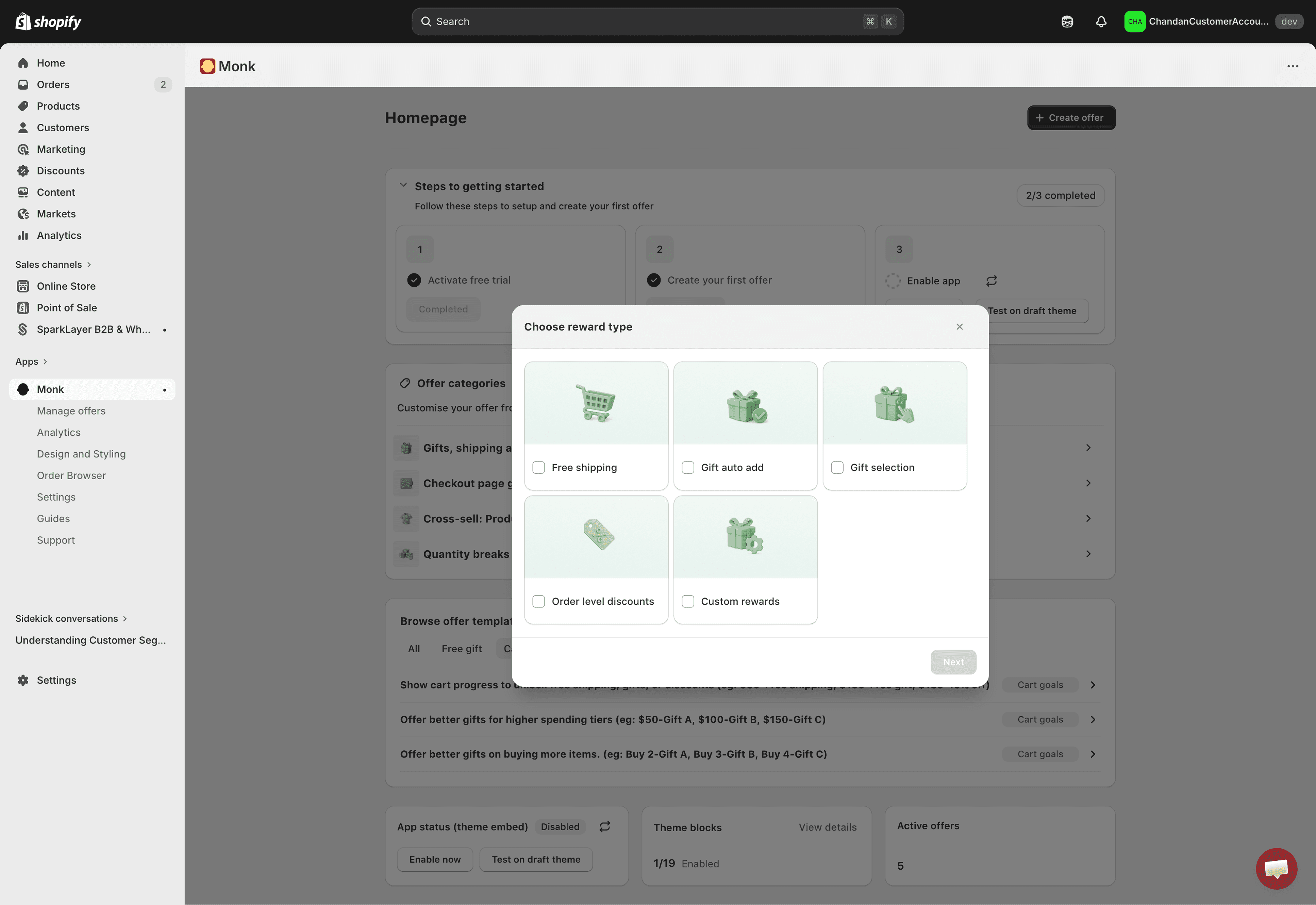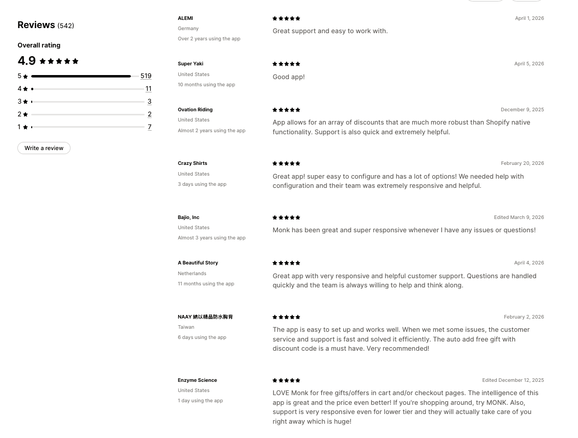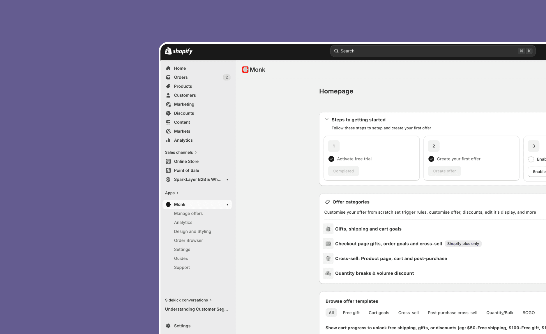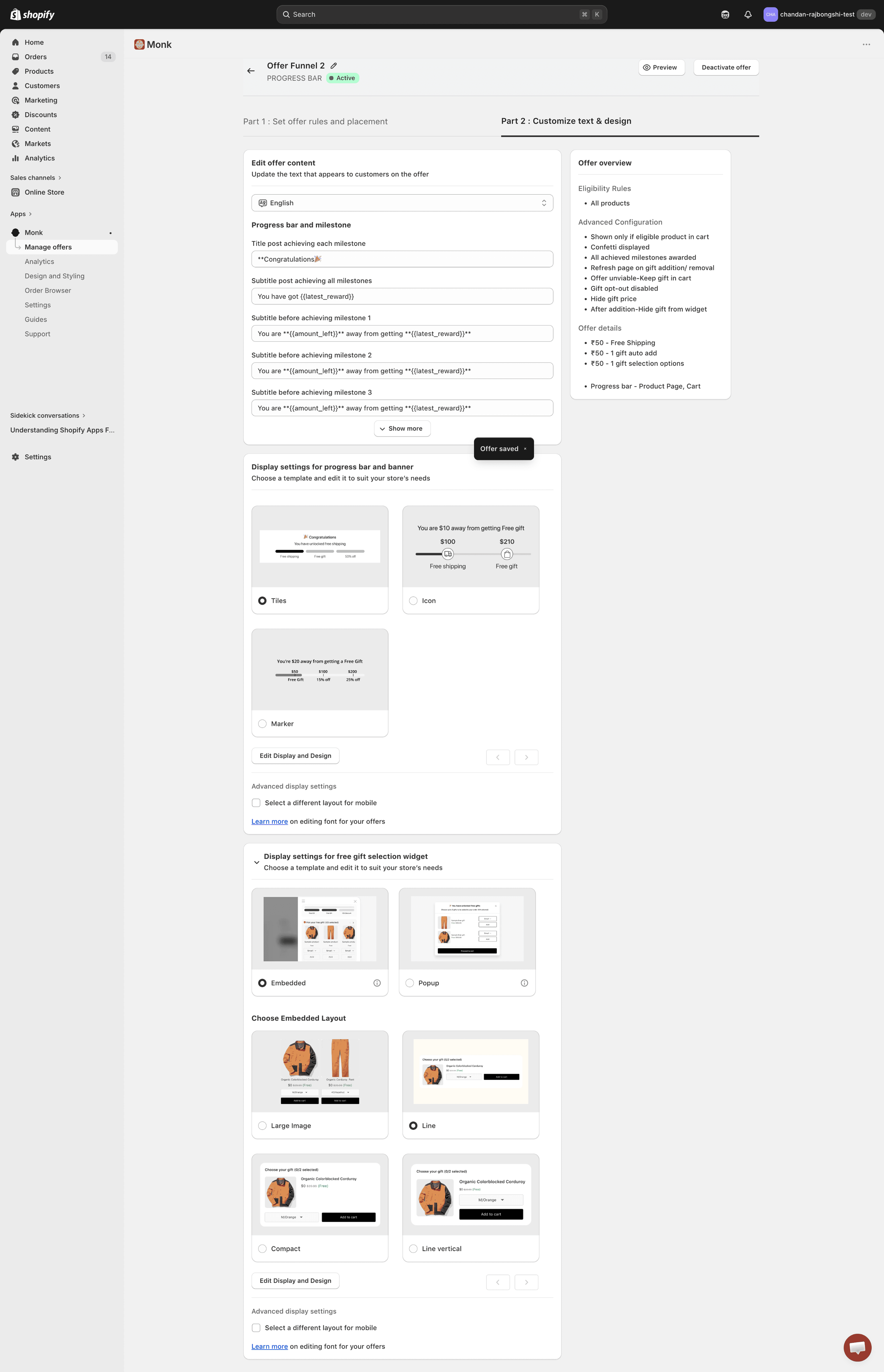 Monk lets Shopify merchants run free-gift campaigns, BOGO deals, tiered reward progress bars, cart upsells, checkout extensions, and post-purchase offers. All from a single dashboard.