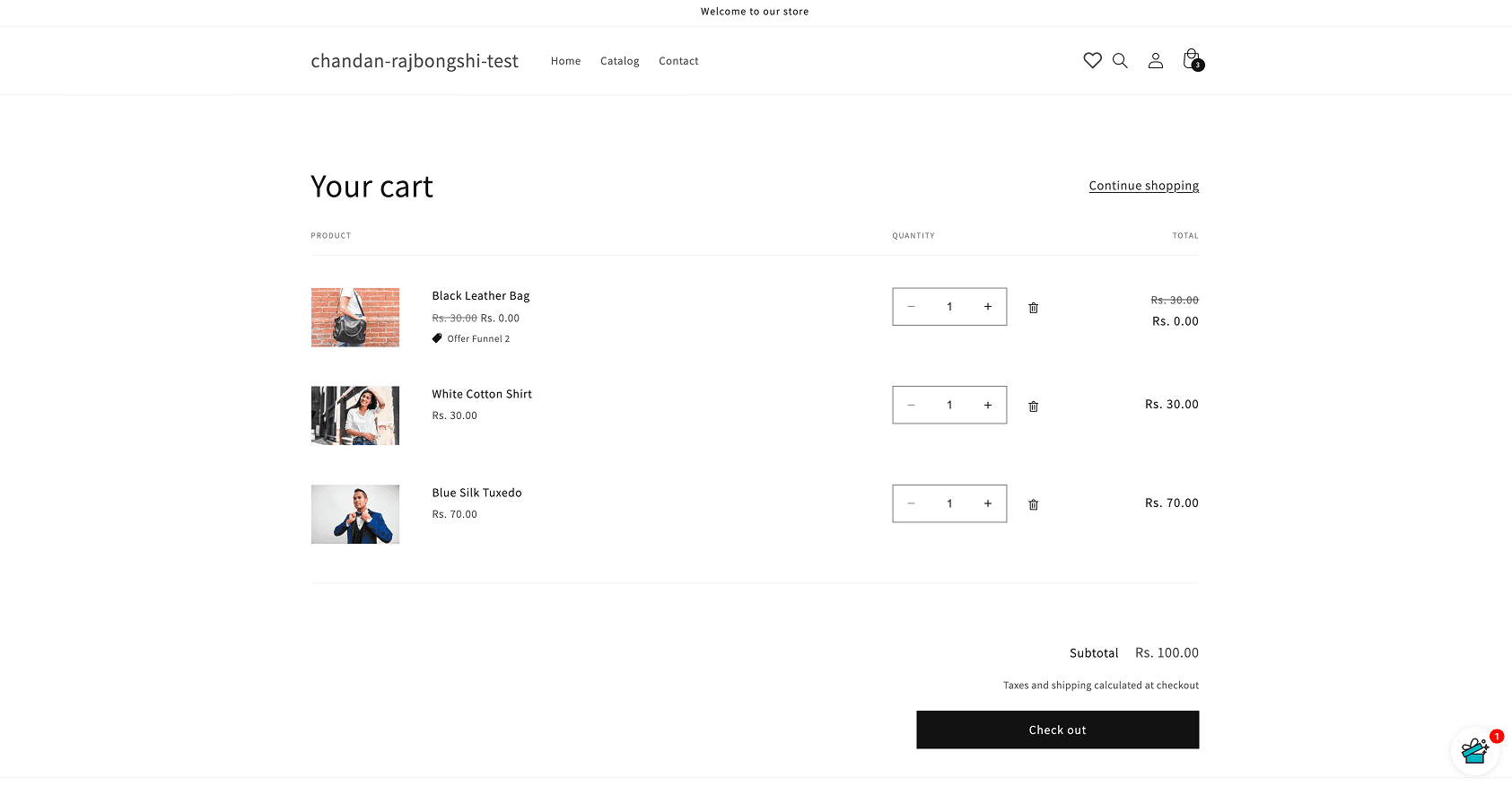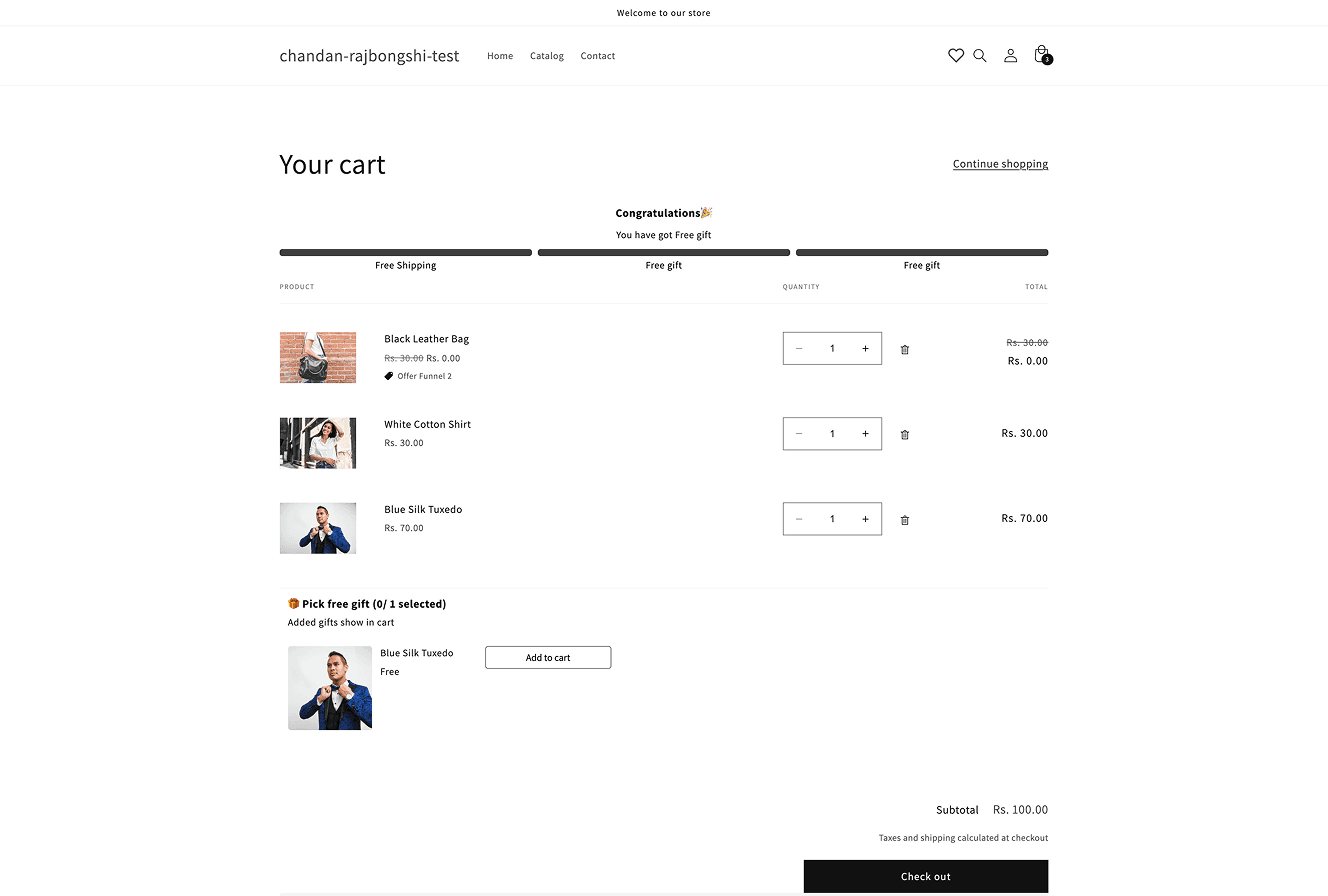 A standard Shopify cart. No reward visibility, no incentive to spend more, no gift mechanic. Merchants have no lever to increase order value at this stage.