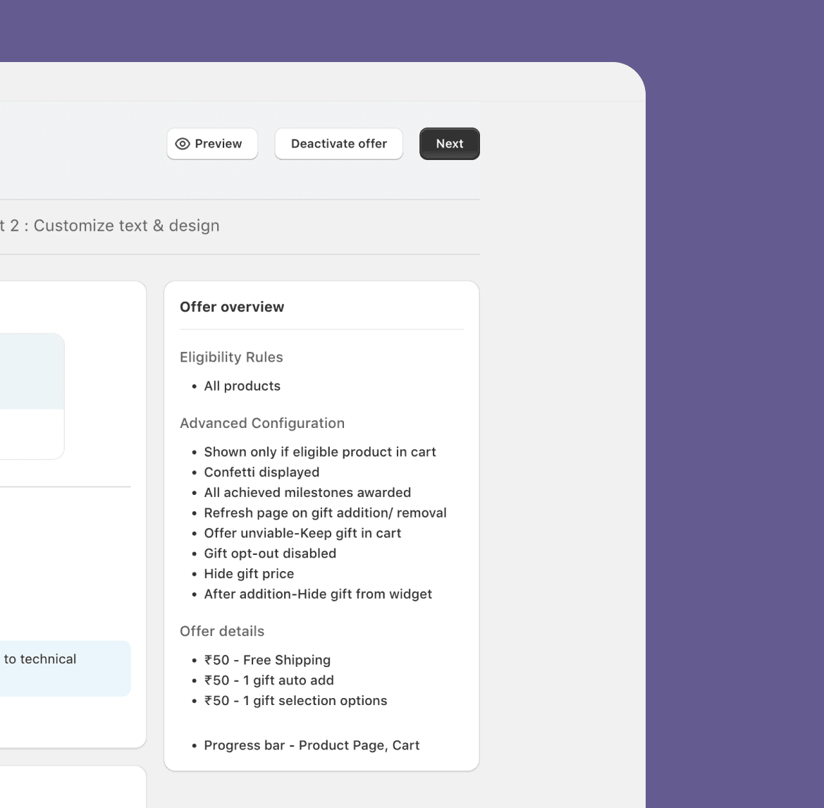 Visible state reduces abandonment. The Offer Overview sidebar made configuration anxiety disappear. When merchants can see their choices being captured in real time, they stop second-guessing and keep going.