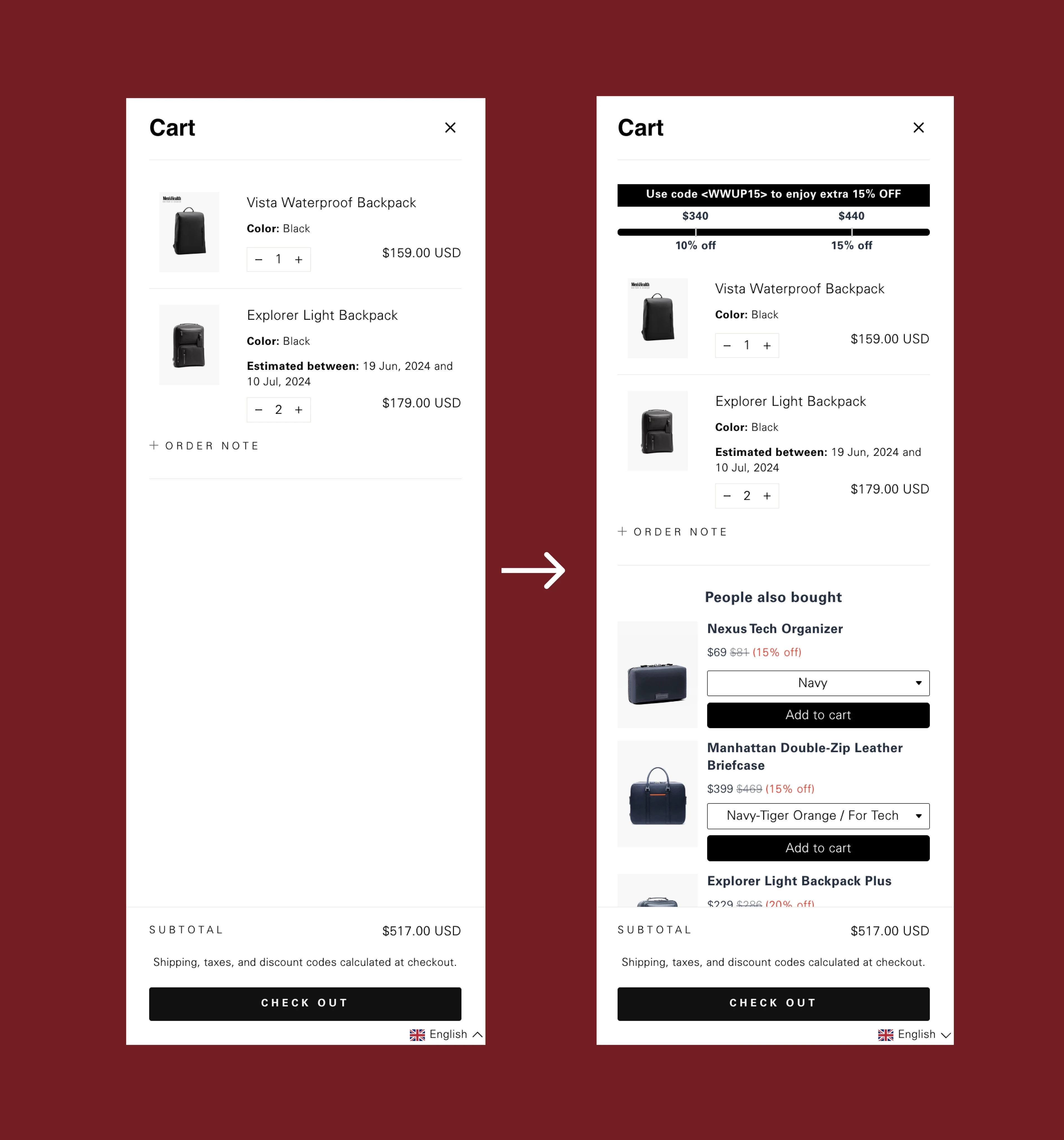 All of the admin configuration produces one thing: a widget that lives inside a merchant's storefront. This is the most direct way to show what Monk does. The same cart, with and without the app running.